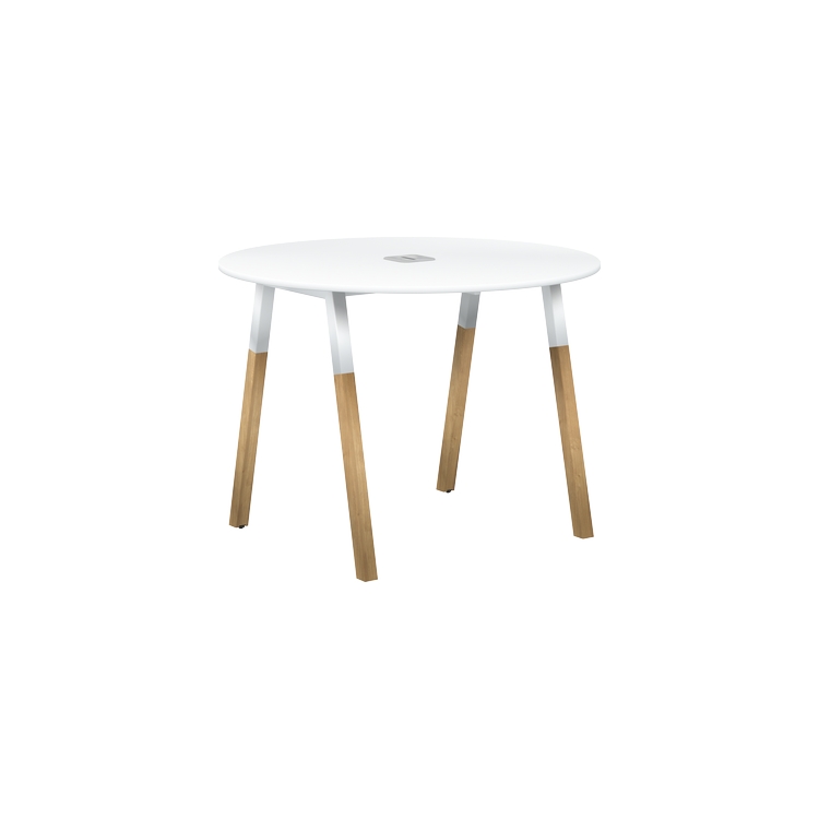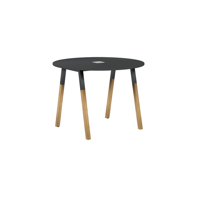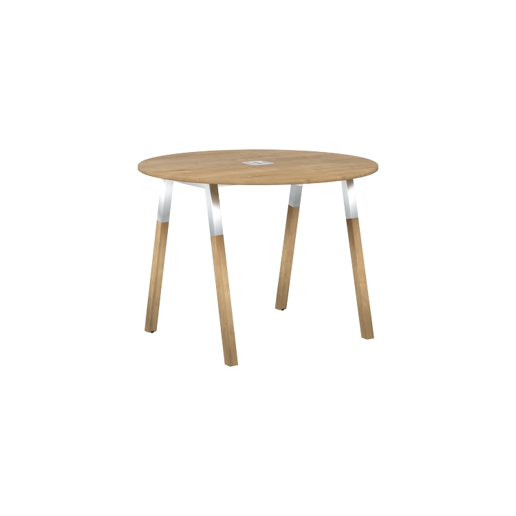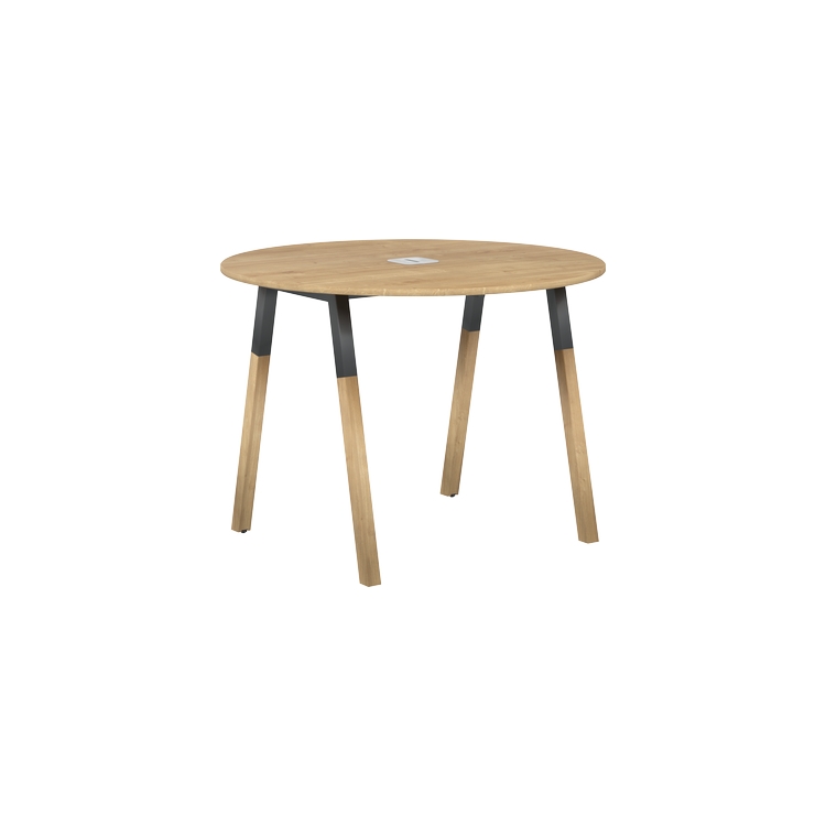 Столешница круглая из ЛДСП т.18 мм. c кромкой ABS т.2.мм, комплектуется квадратной заглушкой кабель-канала в центре, 2-мя траверсами и комбинированными опорами А-образной формы, верхняя часть из трубы 40х40 мм и нижняя часть материал – массив бука; отделка – масло-воск.